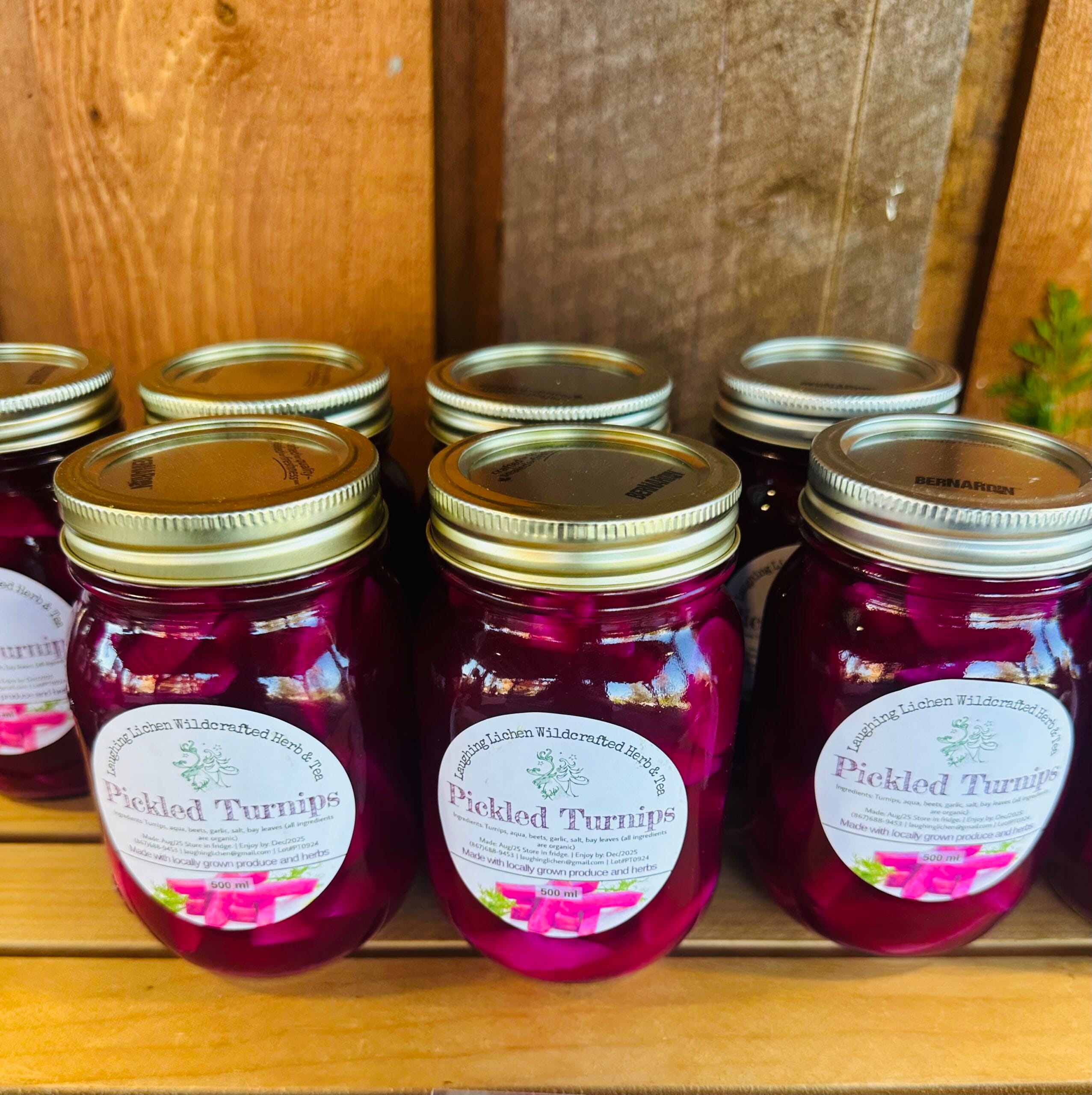 - pickled turnips (fermented) with turnips, beets, garlic and bay leaves all from the farm!